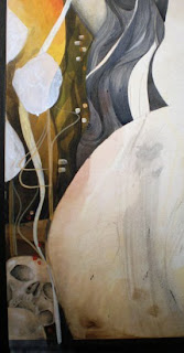 my idea is to use those white peacock feathers as a representation for sperm. there's also a big peacock in the center of the painting, and the tip of its tail goes right to the tree "womb" -- the tree is composed of bodies of tree women that represent the tree aspects of the goddess (Virgin, Mother and Crone.) it's been a while since I started to get drawn to the peacock symbolism, and here it evokes renewal, the Great Round of life.
